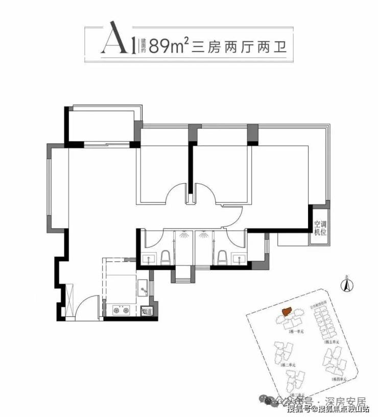 89m²的3房2厅2卫,A1户型,设计的是竖厅格局,LDKB一体化,客厅270°采光设计,S墙设计预留冰箱卡槽位,动静分区,U型厨房,卫生间干湿分离,得房率95-101%(包含赠送),西北朝向看科学公园景观。光明首创客厅270度采光视野+主卧270度转角无柱飘窗+科学公园开阔视野。