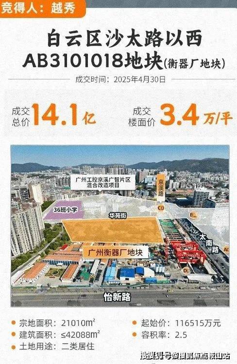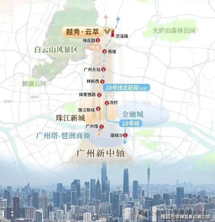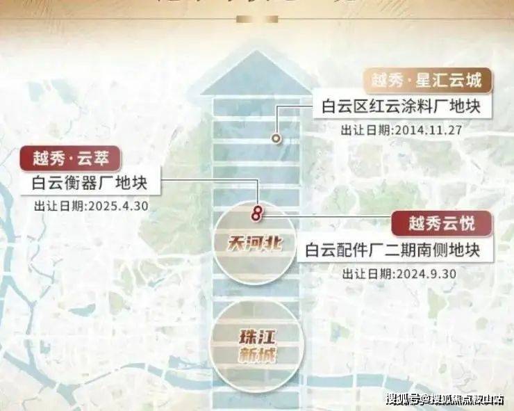 越秀云萃位于越秀云悦北面约 150 米,紧邻地铁 18 号线北延线京溪站。该地块是越秀地产在 2025 年 4 月 30 日经过 26 次竞价举牌,以 14.1515 亿元竞得的,溢价率 21.46%,成交楼面价 33623 元 /㎡,足以见得该地段的价值潜力。
