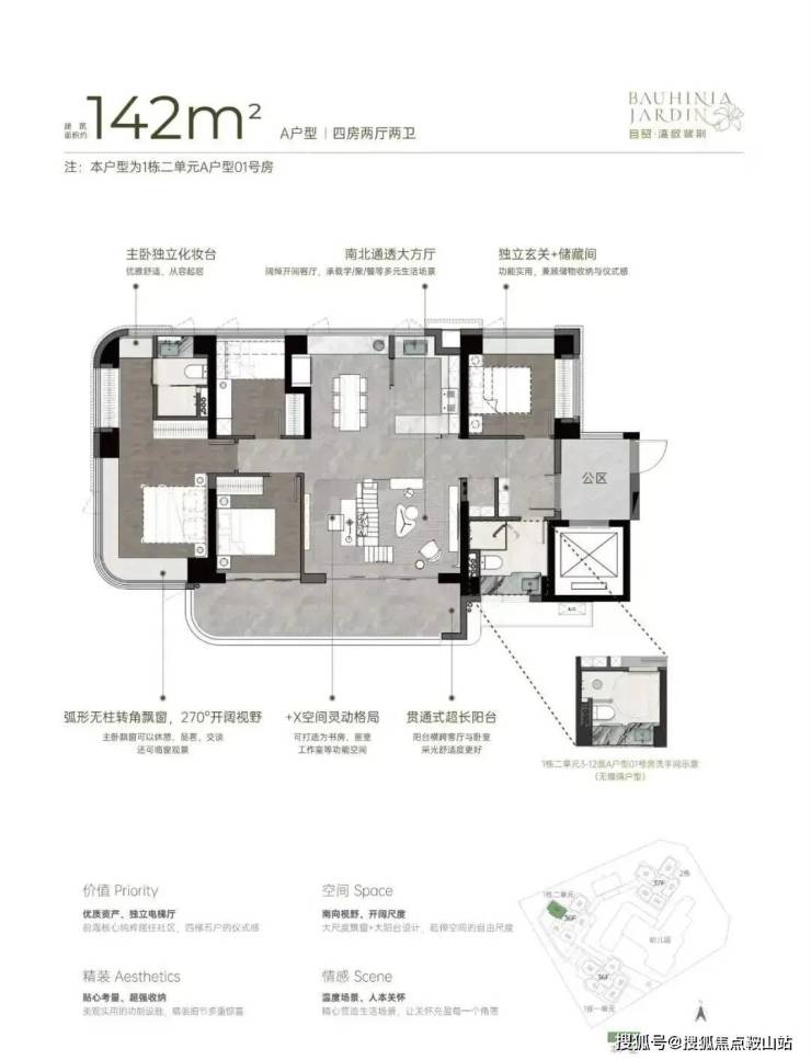 双龙抱珠户型,书房分布于客厅另一侧,且难得是双面采光+270°景观视野。主卧南北通透,且拥有十分开阔的景观面。贯通式阳台联通客厅以及靠近动区的次卧,实现长观景阳台
