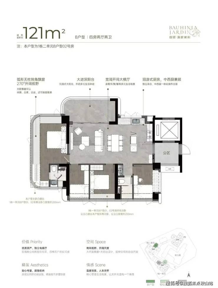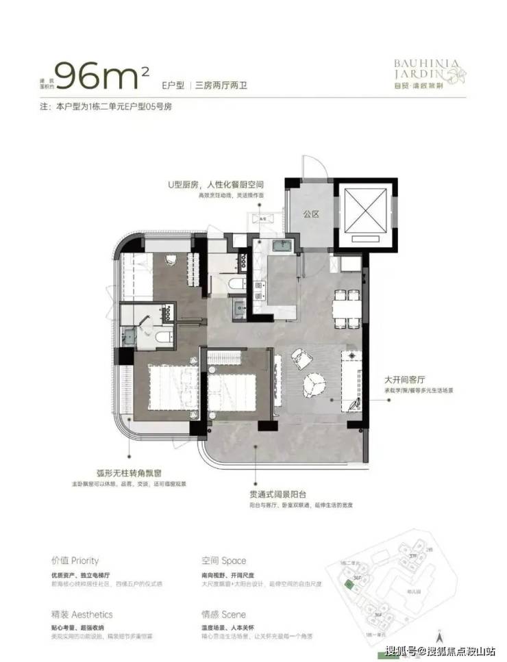 从空间布局来看,U 型厨房的设计极为人性化,大开间客厅与宽阳台是整个户型的最大亮点,西南向视野使得整个户型采光充足,贯通式阔景阳台与客厅、卧室双通,极大地拓展了生活空间的宽度。主卧的飘窗台也是一大亮点,弧形无柱转角飘窗不仅提供了广阔的视野,还增加了室内的采光。