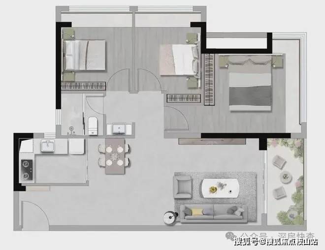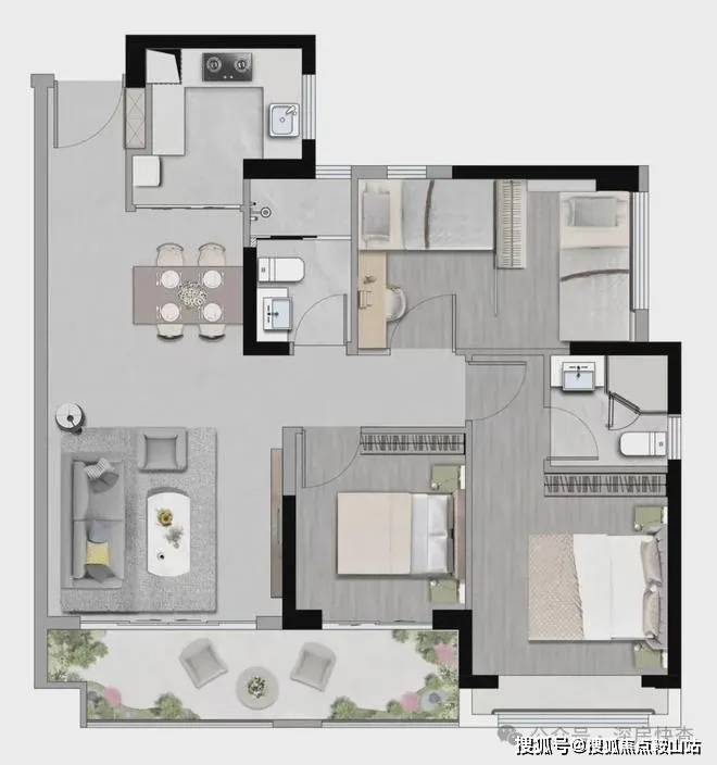 设计的是竖厅格局,客厅3.8米开间,LDKB一体化设计,三开间朝南,3个卧室分别做到了3.2米/2.7米/2.7米的宽度,其中1个次卧可以做多1个房中房,客厅连接次卧出6.5米长的大阳台,U型厨房,卫生间干湿分离,