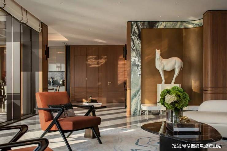客廳設置了沙發區與品茗區,營造出一種舒適、尊貴的氛圍。