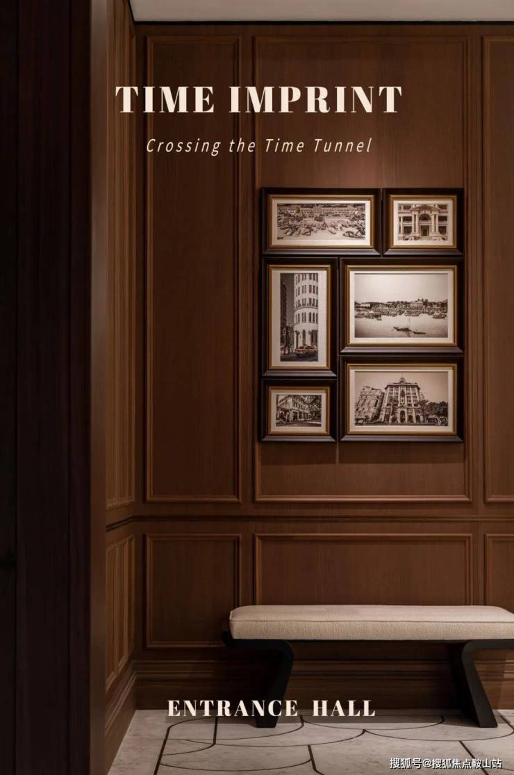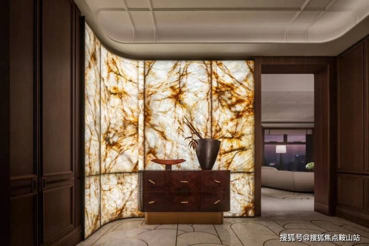 玄關不僅是進入住宅的通道,更是展示其儀式感的空間。拱形元素創造出一種古典和優雅的視覺效果,地面的拼花,採用來自希臘雅典的羊脂灰石材,以其溫潤的灰白色和細膩的質感,帶來了一種高貴而自然的感覺。搭配銅條帶來的金屬光澤,不僅提升了空間質感,還加強了視覺效果。歐式經典護牆板搭配發光石材,巧妙地形成視覺衝突,軟裝的加入形成了和諧的融合,呈現出一種穿越時光的奢華感。
