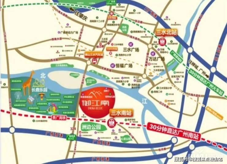 交通方面,高铁南站距项目2公里,5分钟直达。广佛肇轻轨三水北站与项目20分钟车程,40分钟入广州,25分钟到佛山,15分钟到肇庆。在建的佛山地铁4号线将连接三水,佛山地铁12号线也进入规划阶段 。