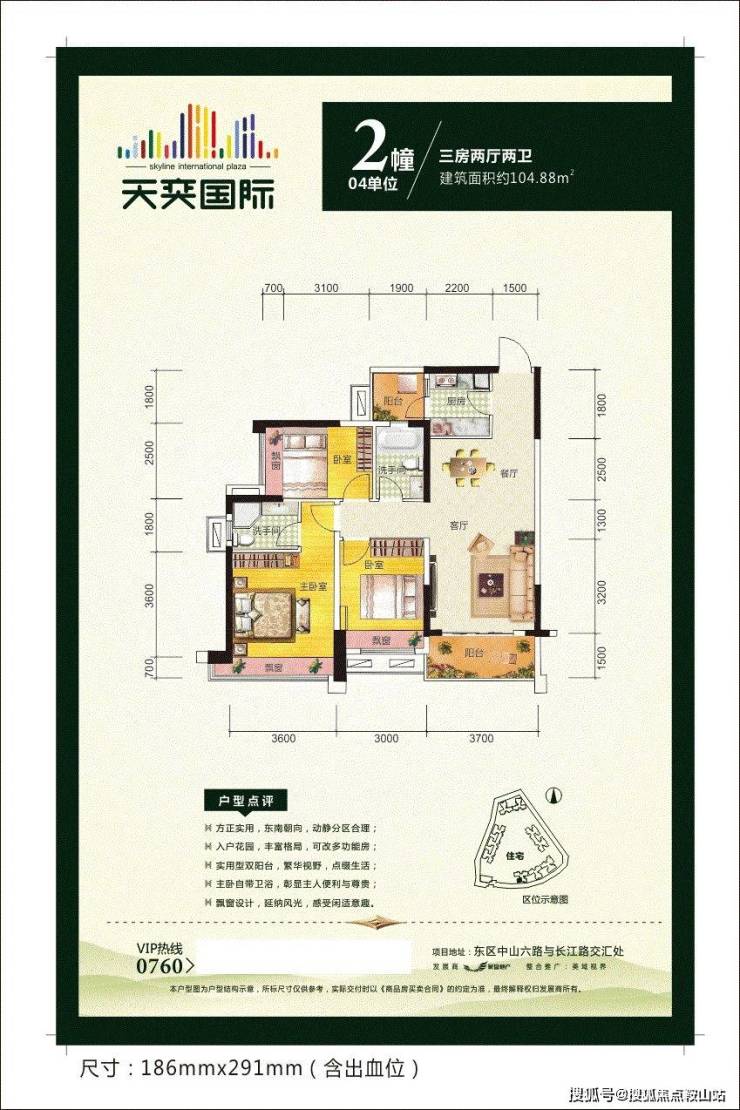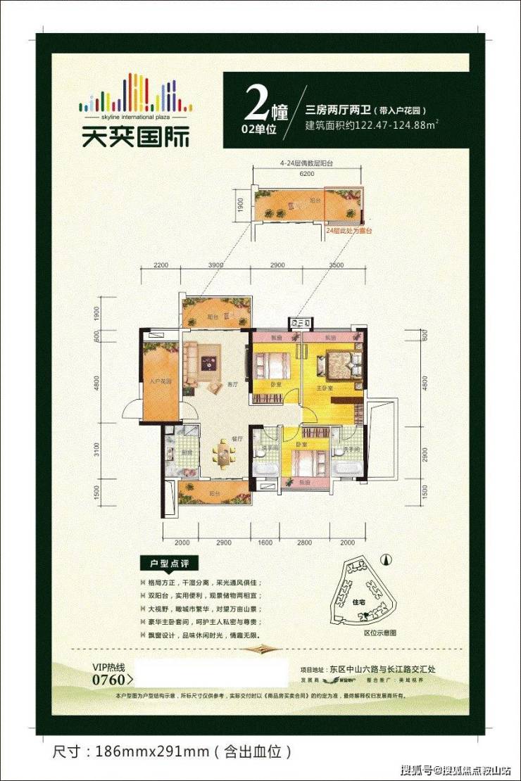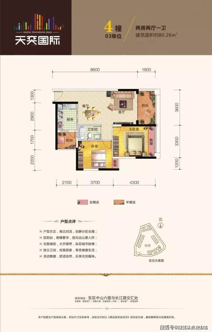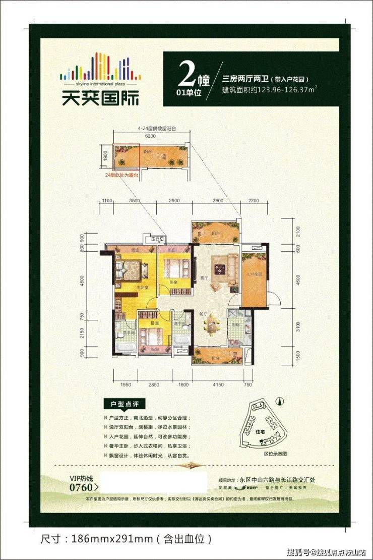 天奕国际广场,雄踞中山城市东,即中山路与生态中轴长江路交汇处;更毗邻城市“绿肺”——紫马岭公园,随着城市向东发展的进程加快,城区中山路沿线物业,首期住宅组团将推出,80-122㎡的二房、三房单位,尽享东区CBD核心区的商务繁华、休闲娱乐购物、优质教育医疗、生态居住等最极致的生活资源。