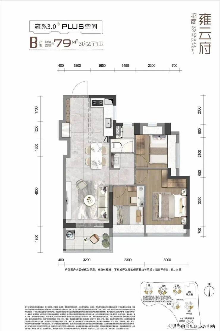 79㎡的3房2厅1卫,设计的是竖厅格局,客餐厅一体化,客厅3.2米开间,S墙设计预留冰箱位,3个卧室分别是3/2.4/2.3米的宽度,L型厨房,卫生间三段式分离设计,得房率:78.68%(不含赠送),阳台西南及东南朝向