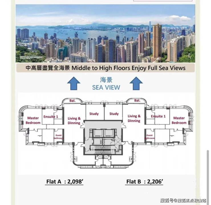单位实用面积:A户型2,098平方呎 B户型2,206平方呎