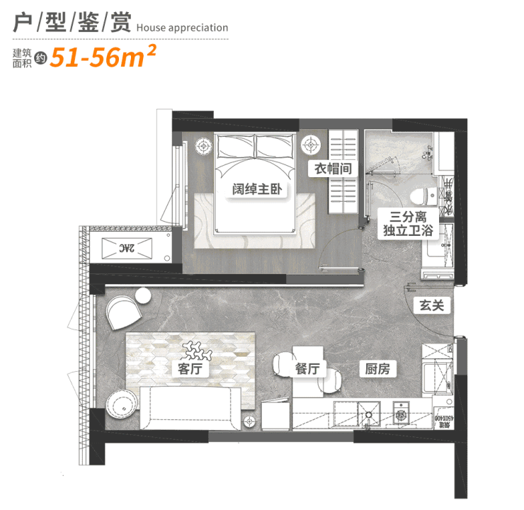 建面约51-56㎡的一房一厅一卫,功能分区明确,互不干扰,客餐厨一体化设计,带来更阔绰的居住空间。