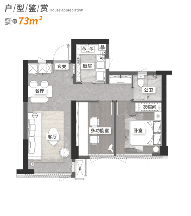 再看看建面约73㎡的两房两厅一卫,是传统的竖厅户型。