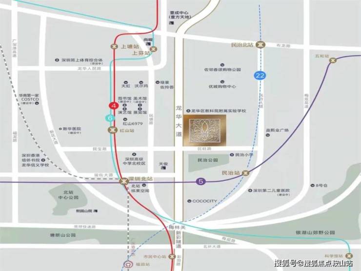 现有456号三条地铁(深圳北站/红山站/民治站),规划中22号线(民治北站)27号线(民宝站/华城站)