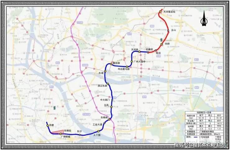 线路全长约44.2公里,全部采用地下敷设方式,全线共设车站32座,另外,代建一座车站(城轨琶洲站),其中换乘站20座,设置赤沙车辆段1座。车辆采用8节A型车编组,最高运行速度80公里/小时。