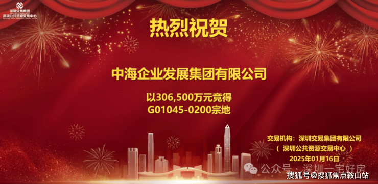 中海大运玖章花园的地块G01045-0200于2025年1月16日在深圳第一轮集中土拍中经过90分钟246轮激烈竞争,最终以30.65亿元斩获,楼面价高达2.96万/㎡,溢价率70% 。此次土拍吸引了华润、招商、中海、越秀、绿城、深业、建发以及南山地产等8家知名房企参与,竞争之激烈足见该地块的珍贵程度 。