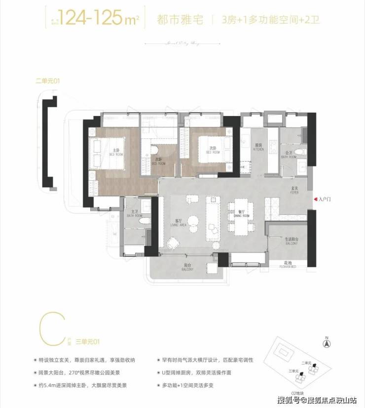 01 C户型——建面约124-125㎡3+1多功能空间:横厅户型,双阳台设计,西北朝向,看向绿地公园及花园。大横厅+通透采光:采用“双厅合一”的大横厅设计,摒弃多余过道,让客餐厅空间感直接拉满。