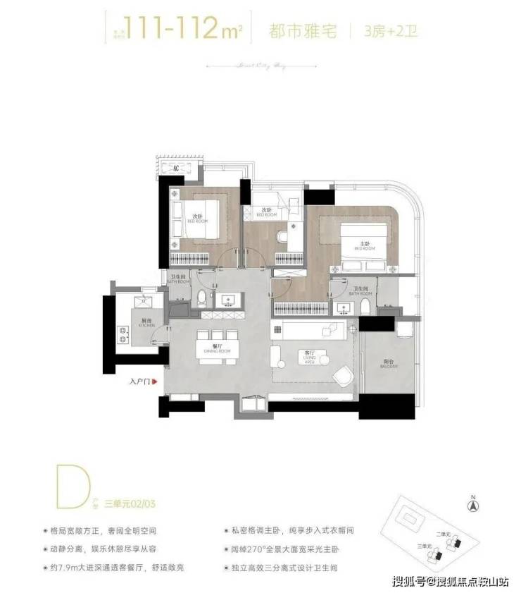 02/03 D户型——建面约111-112㎡3房2卫:经典竖厅户型,东南朝向,看城市景观。户型格局方正,全明设计。客厅拥有约3.45米开间,与餐厅、阳台一体化连通,空间感开阔。主卧区是亮点,约23㎡包含步入式衣帽间和干湿分离主卫,并享有270°采光。
