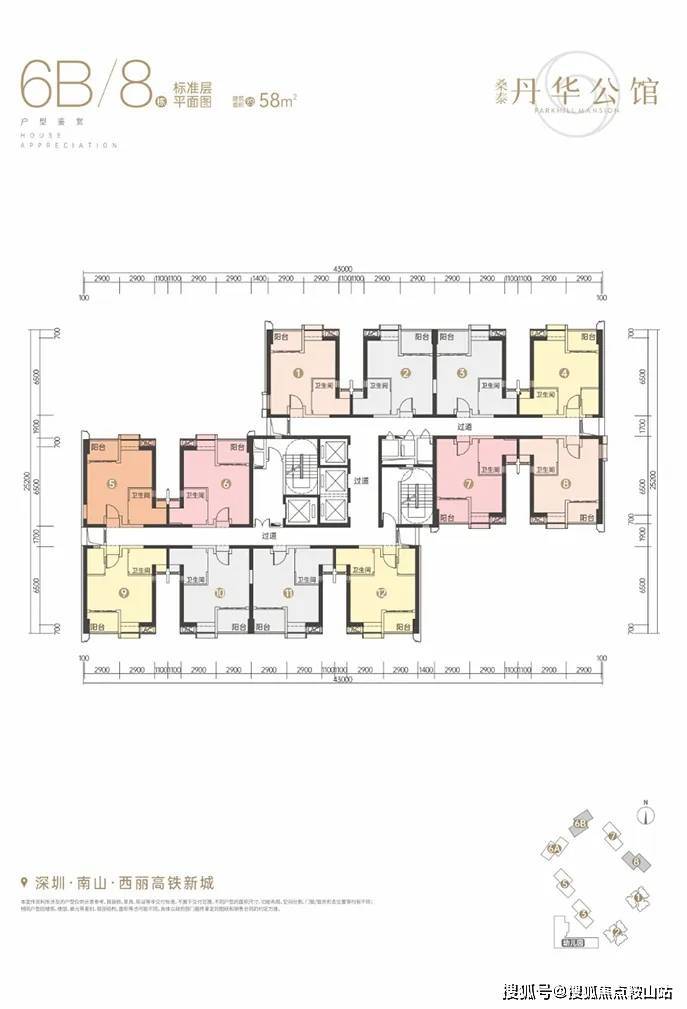 项目核心亮点突出,性价比显著,折后单价6.55万/㎡起,58㎡复式总价380万起,是南山核心稀缺300万级上车盘;主力58㎡复式、101㎡平层,复式3.9米层高可改3-4房,得房率约82%,香槟金铝板外立面质感出众,空间利用率远超同片区竞品。