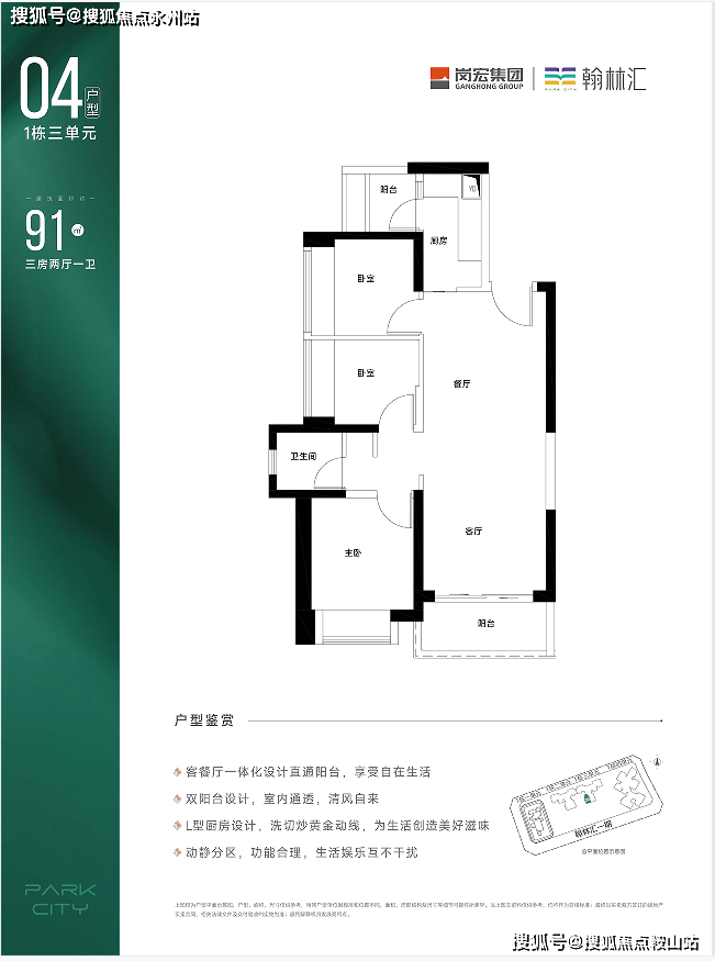 1㎡的3房2厅1卫,设计的是竖厅格局,客厅3.4米开间,LDKB一体化设计,L型厨房还带1个小生活阳台,卫生间三段式分离,得房率约71%(不含赠送),西南或东南朝向。✨✨岗宏翰林汇 开发商电话:400 -859-7606【☎☎开发商电话已认证】✨✽✽✽✽