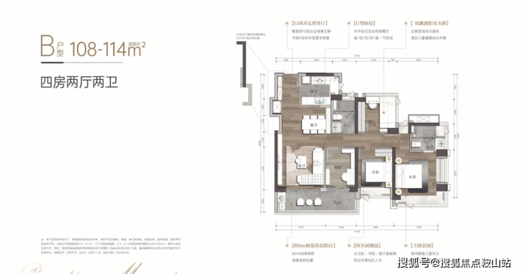 108-114㎡竖厅四房:LDKB一体化,3.7米客厅+6米超长阳台,98% 得房率,小面积也能住出大尺度。