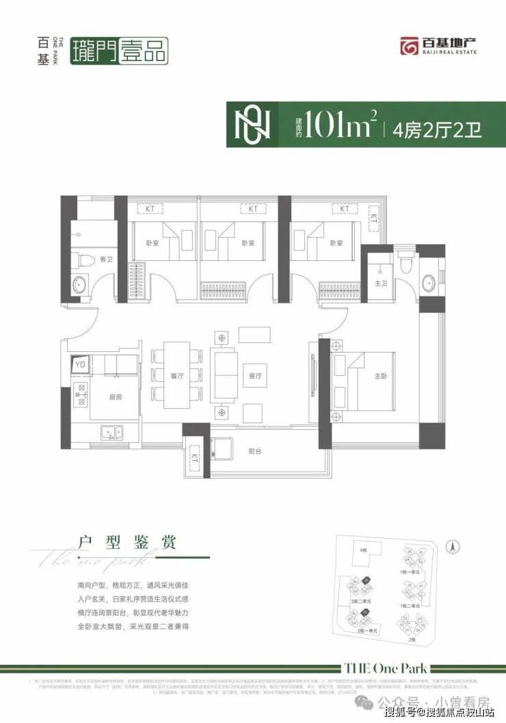 101㎡的4房2厅2卫设计的是横厅南北通透格局,进门入户玄关,LDKB一体化设计,U型厨房,卫生间干湿分离,阳台主朝东南向。