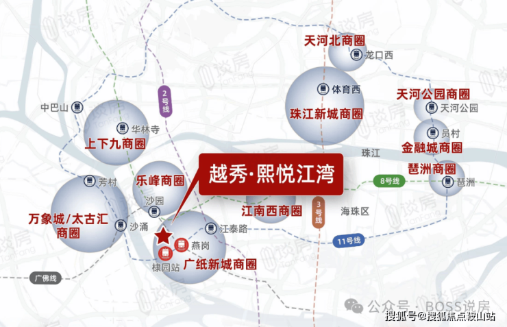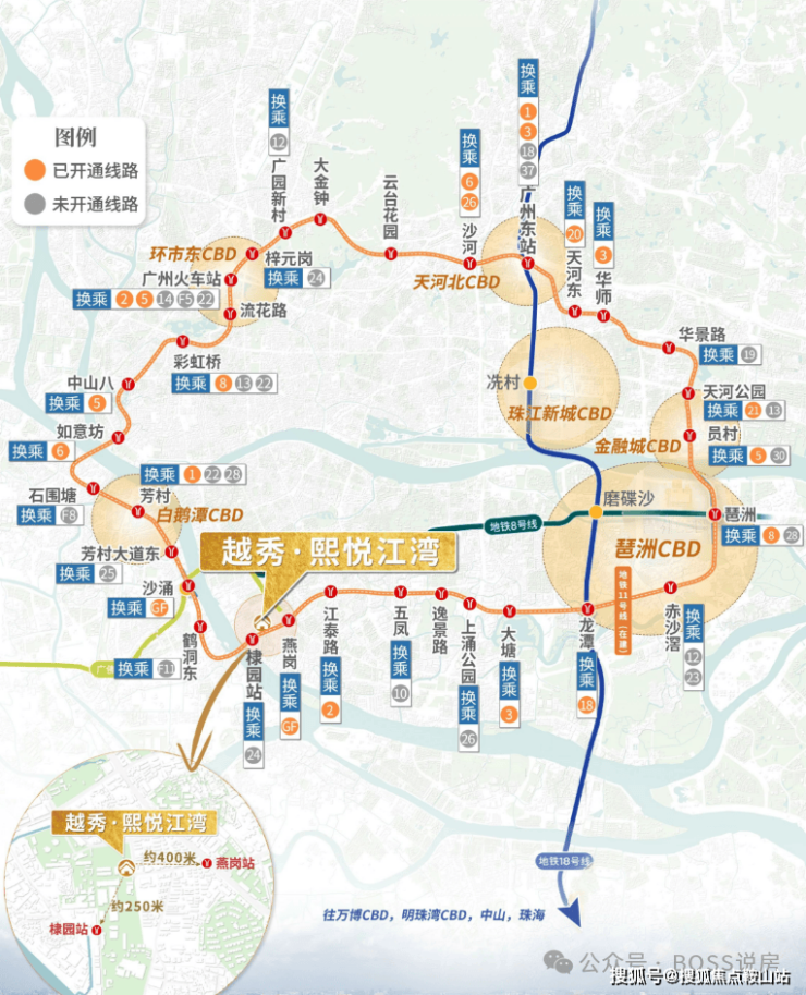 地铁:距离广佛线燕岗站B口约 400 米,广州地铁 11 号线棣园站约 250 米,7 站可达南站,7 站可达琶洲,可快速连接全城,虹吸广佛优质资源