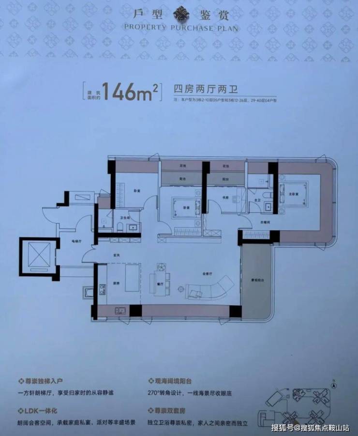 总占地面积约1.58万㎡,总建筑面积约14.1万㎡,计容建筑面积约10.44万㎡,容积率6.54,绿化率40.01%,共由4栋31-45层高住宅组成,4梯5户(低区)/4梯4户(高区)、约125㎡以上专梯专户
