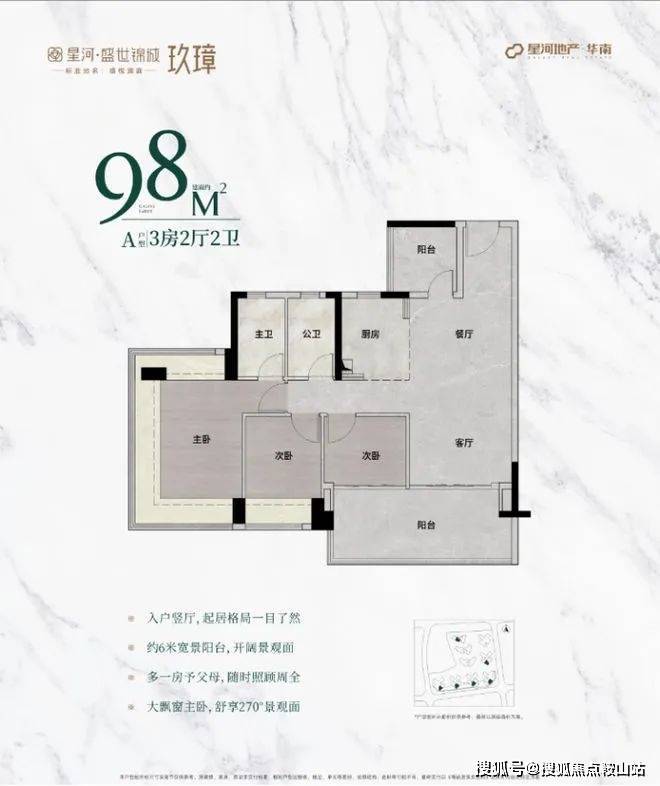98㎡三房:南向双阳台,主卧270°飘窗,总价300万起,适合刚需家庭。