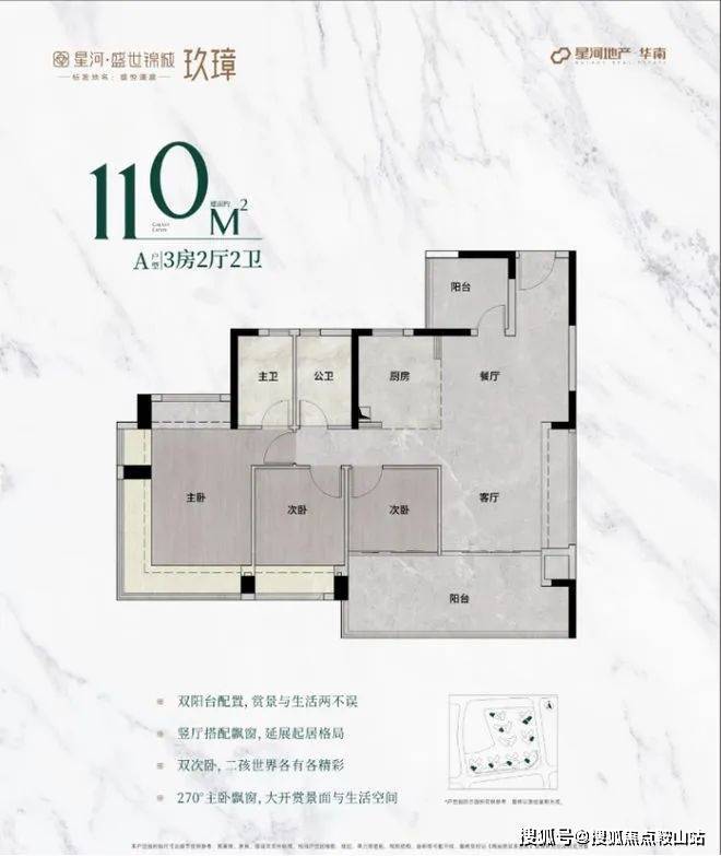 110㎡三房:横厅设计,6米跑道阳台,客餐厅面宽4米,改善客群优选。