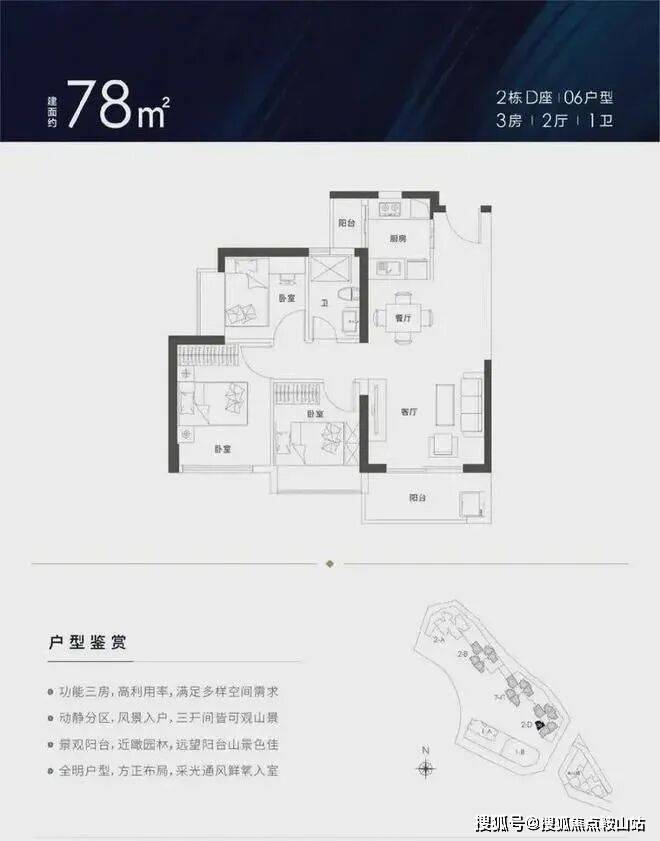 78㎡的3房2厅1卫,设计的竖厅格局,三开间朝南,厨房带小阳台,客厅西南朝向,高楼层可看山景。