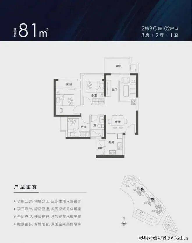 79-81㎡的3房2厅1卫,设计的竖厅格局,厨房带小阳台,客厅东北朝向,高层可看水库景观。