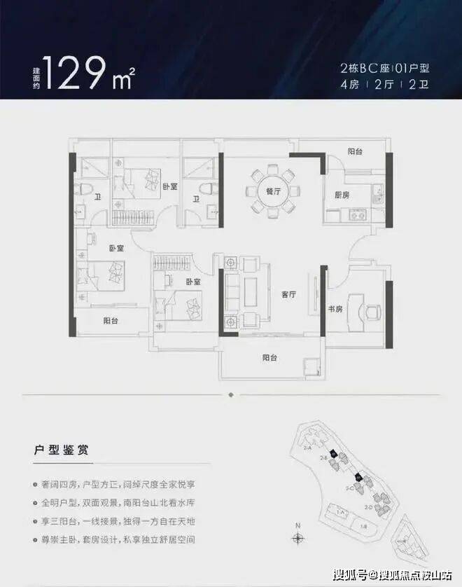 129㎡的4房2厅2卫,设计的竖厅南北通透格局,客厅主卧双阳台设计,厨房也带小阳台,客厅朝西南向,高层可享受双面景观。