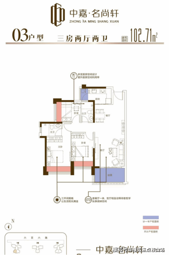 中嘉名尚轩位于中山市火炬开发区-民众街道壹加壹斜对面·开发商:中山市中嘉木业制品有限公司(民众丽豪、丽星、丽逸项目开发商)·产品面积:建筑面积约102-125㎡三房两卫、139㎡四房室住宅,首开盘1幢户型102、110、112、118㎡三房两卫(毛坯)·总占地面积:21085.4㎡(分两期开发,共6幢住宅)·一期建筑面积:41222.69㎡(一期共3幢)