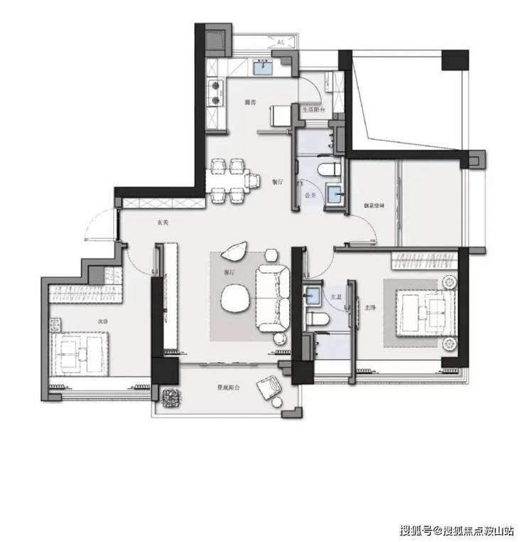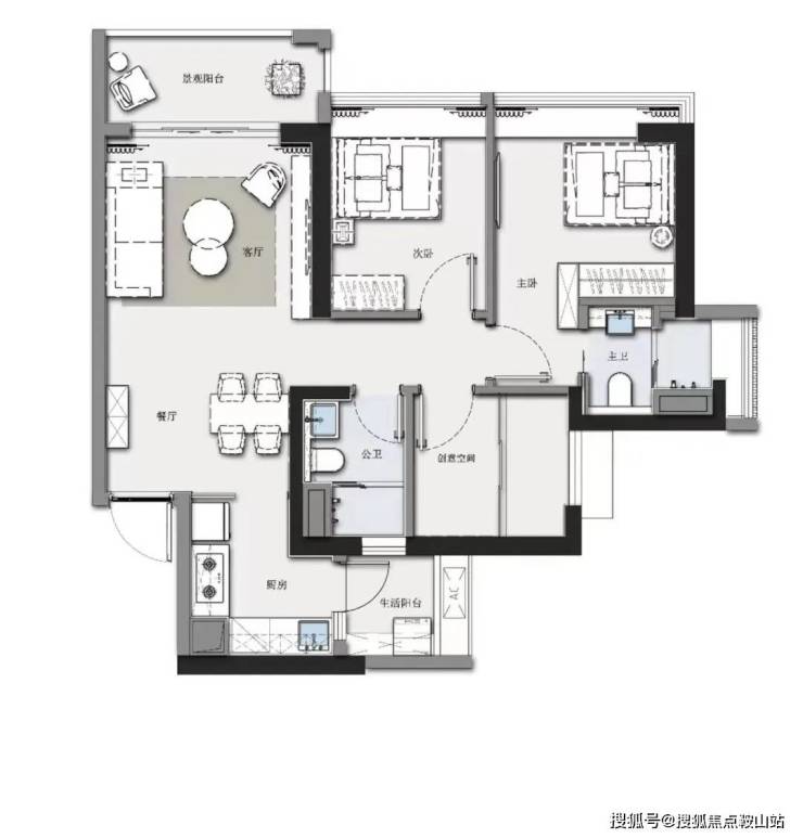 建面88平三房两卫,B栋户型,双阳台设计,主卧套房设计