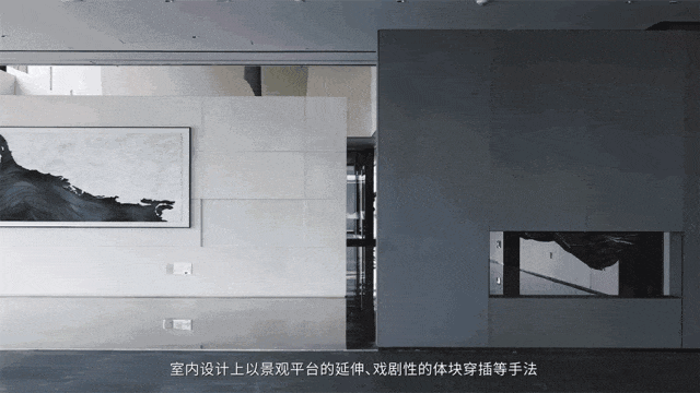 “设计的戏剧性”。通过室内景观平台延伸设计、戏剧性的体块穿插等手法,打破二元对立的静态空间。▽
