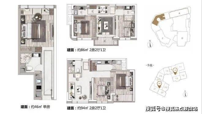 C座:建筑面积约52-95㎡(3梯8户) 217-519㎡(3梯3户)