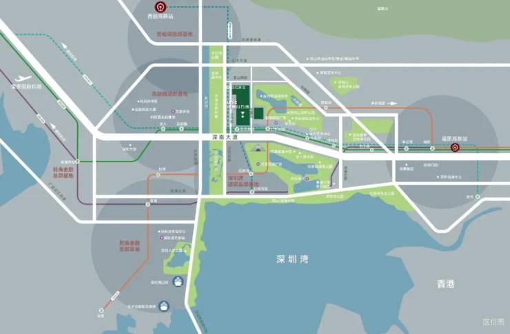 华侨城处于南山和福田中间,而绿景白石洲处于华侨城和科技园中间,因此更靠近南山,距离华润城片区就1站地铁。