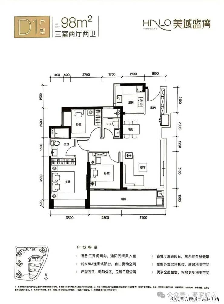 D1户型-98㎡的3房2厅2卫,设计的是竖厅格局,客厅连接次卧出阳台(有6.5米长),三开间朝南,S墙设计预留冰箱位,U型厨房,得房率:80.12%(不含赠送),有西南向或东北朝向。