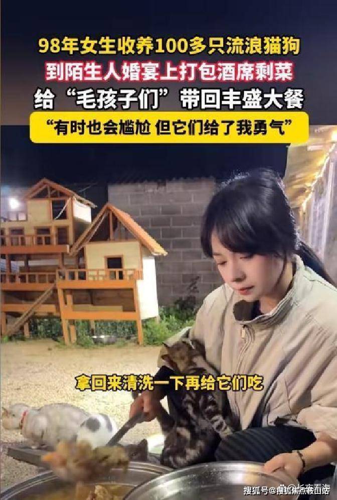 养这么多猫,吃饭的钱自然很多。她算了算,一只猫一天大概花3块钱伙食费,那么一天就是300多块。为了能继续养它们,她一边做兼职剪辑,一边想办法省钱。有一次,她去参加婚宴,看到桌子上好多菜都没怎么吃就被收走了。她突然想:这些剩菜,是不是可以带回家给猫咪们加餐呢?我觉得这个想法真是太聪明了,既能省钱,又能避免浪费。