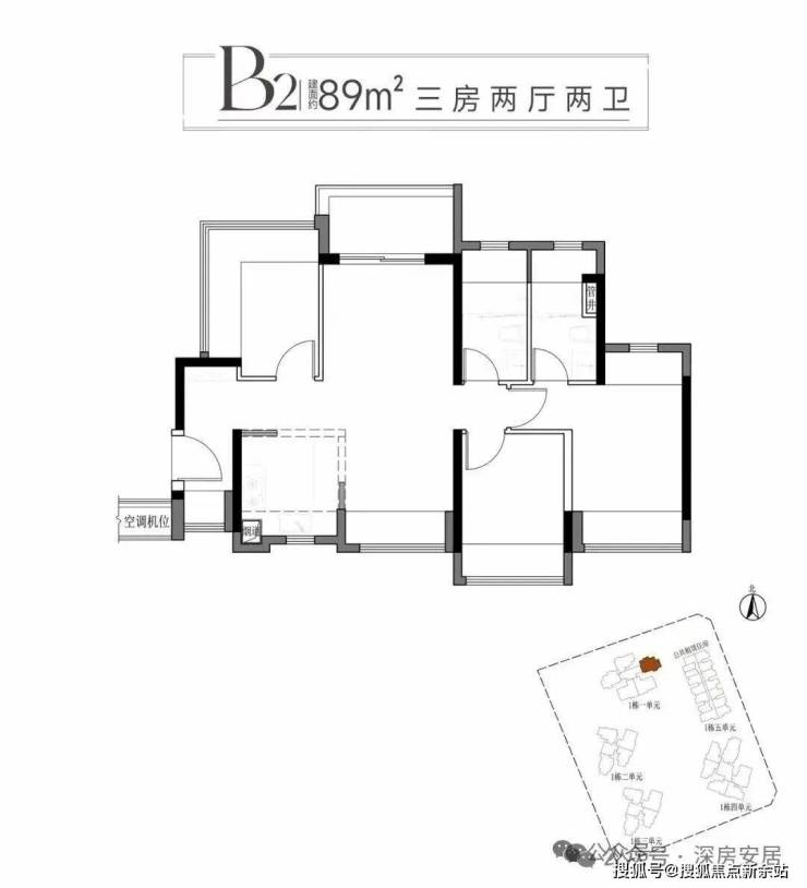 89m²的3房2厅2卫,B2户型,设计的是竖厅南北通透格局,进门入户玄关,客餐厅分离设计,五开间朝南,主卧南北双飘窗,次卧270°无柱飘窗,U型厨房,卫生间干湿分离,得房率95-101%(包含赠送),阳台主朝西北向。光明新房市场少有的89平竖厅南北通户型