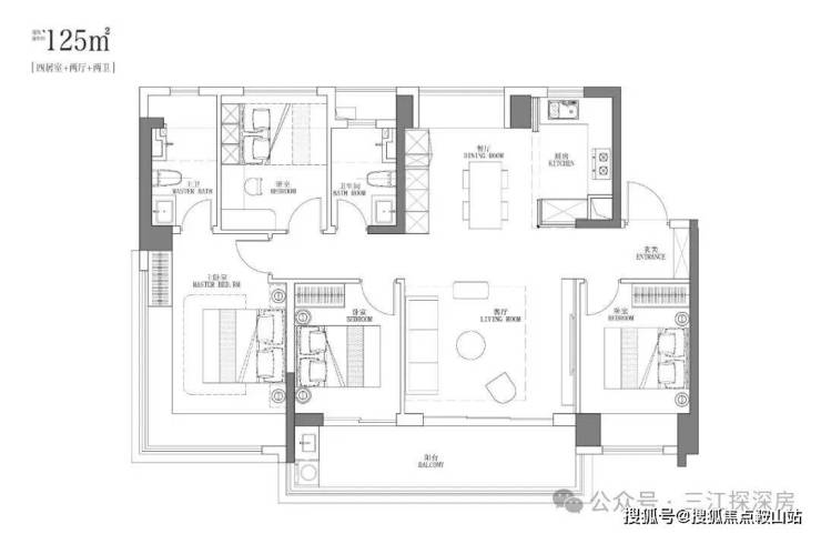 竖厅南北通透格局,进门入户玄关,客厅4.3米开间,餐客厅分离设计,四开间朝南,全屋八面飘窗,主卧做到了270度转角无柱飘窗,U型厨房,卫生间干湿分离,得房率约95.2%(包含赠送),客厅连接次卧出7.1米长的观景大阳台,全部主朝西南向,看大运公园景观。