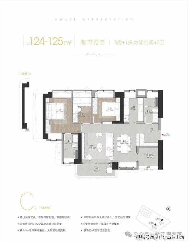 122-124㎡3+1房2厅2卫,有竖厅、横厅和双龙抱珠户型,跟之前03地块户型完全一致。