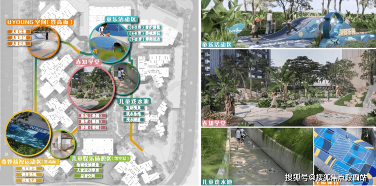 社区中央就是高端豪宅标配型镜面泳池,旁边还设置了魁星书院;其中还打造了童趣乐园、儿童戏水池、益智运动区等儿童友好空间,孩子可以在这里进行攀爬、戏水、轮滑、器械游玩等等;