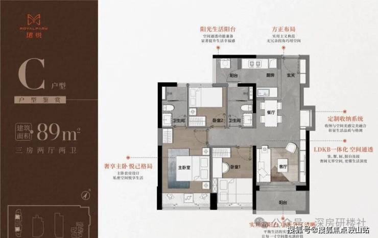 89㎡三房二卫A/B户型,位于1栋一单元,两开间阳台,主卧都有双面凸窗赠送。
