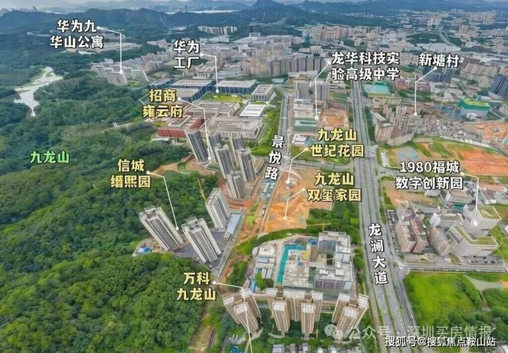 招商雍云府,位于深圳市龙华区福城街道九龙山社区龙澜大道旁,地处九龙山智能科技城核心区,规划范围9.81平方公里,是深圳市重点区域之一。项目紧邻华为新基地(直线距离约50米)和美团大湾区总部(约200米),处于龙华区福城街道与观澜街道交界处,西侧紧邻大水坑社区公园,北侧为九龙山风景区,生态资源丰富。