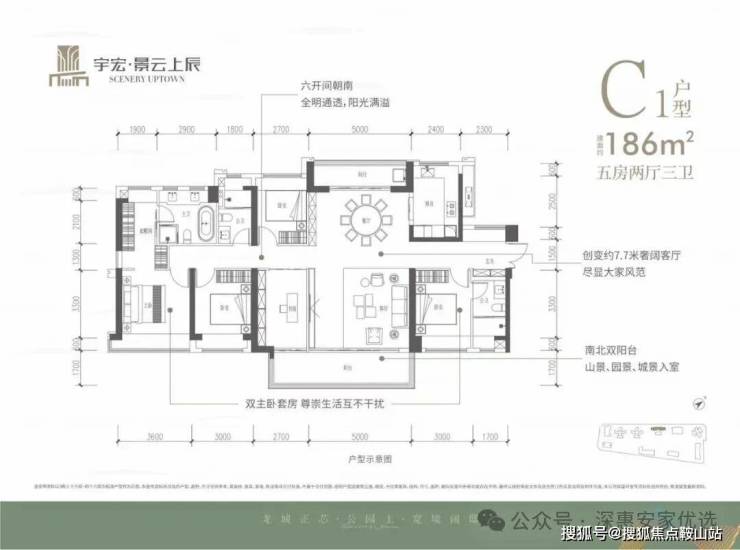 186㎡的5房2厅3卫,设计的是竖厅南北通透格局,进门入户玄关,客厅5米开间,客餐厅分离设计,六开间朝南,南北双阳台,分别做到了主卧22.42㎡/次卧11.7m²/次卧11.7㎡/次卧10.53㎡/次卧8.91㎡(包含墙体飘窗),U型厨房,卫生间干湿分离,得房率约78.1%(不含赠送),客厅连接次卧出6.2米长的大阳台,主朝东南向。