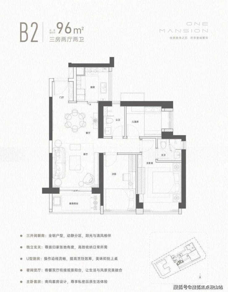 96㎡的3房2厅2卫,设计的经典竖厅格局,餐客厅一体化设计,三开间朝南,L型厨房,得房率72.47%(不含赠送),东南朝向。