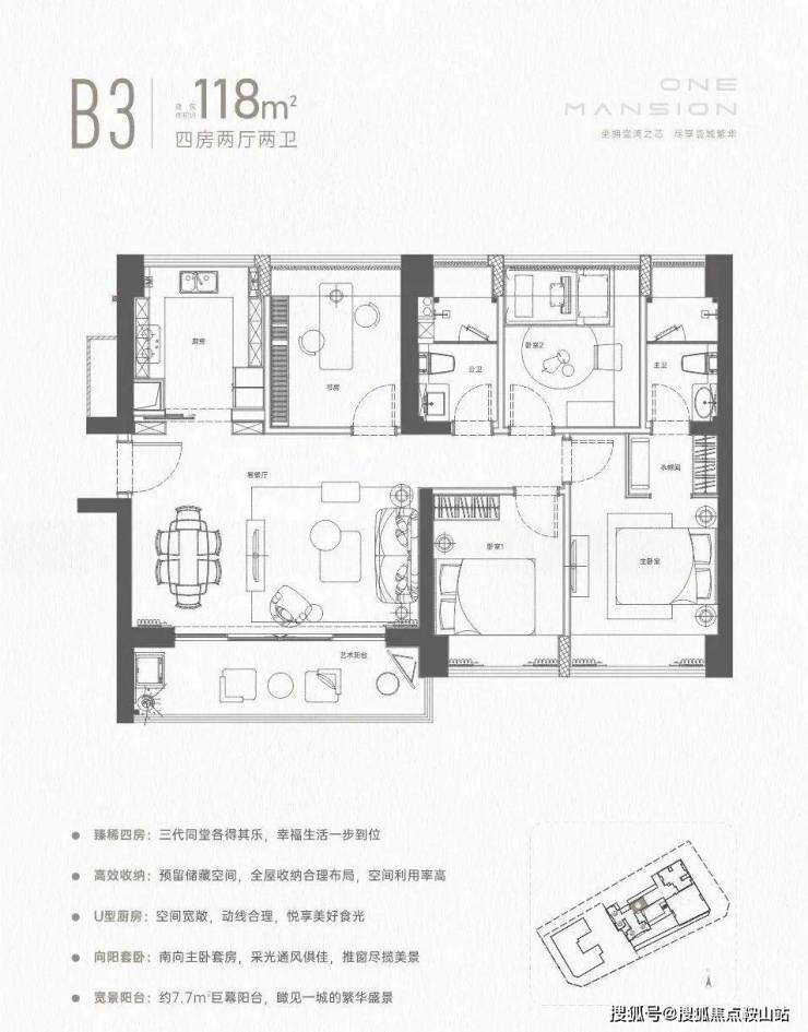 118㎡的4房2厅2卫,设计的横厅南北通透格局,全屋飘窗设计,三开间朝南,U型厨房,约7.7米长超大阳台,得房率72.47%(不含赠送),阳台主朝东南朝向。