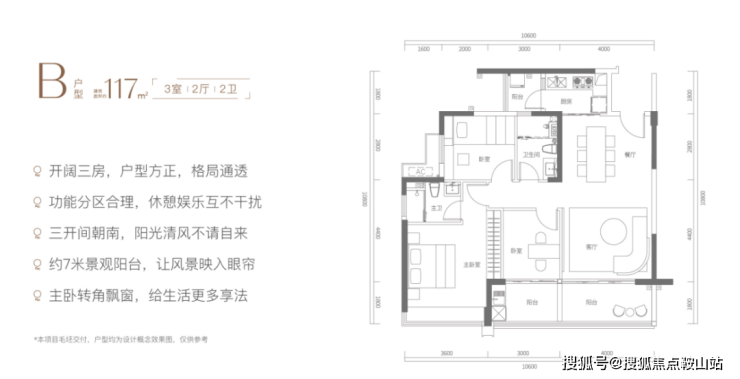 117㎡的3房2厅2卫(B户型),设计的是竖厅格局,客厅4米开间,LDKB一体化设计,进门独立玄关,客厅连接次卧出7米长的大阳台,3个卧室分别做到了3.6米/3米/2.8米的宽度,L型厨房还带1个小生活阳台,得房率:74.07%(不含赠送),大阳台主朝西南或东南向。