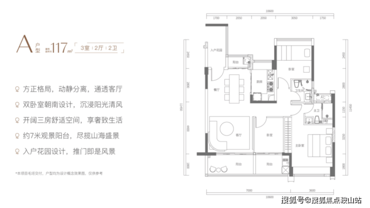 117㎡的3房2厅2卫(A户型),设计的是竖厅南北双阳台通透格局,客厅3.75米开间,LDKB一体化设计,赠送入户花园,客厅连接次卧出7米长的大阳台,3个卧室分别做到了3.6米/3.25米/3.05米的宽度,得房率:74.07%(不含赠送),大阳台主朝西南或东南向。