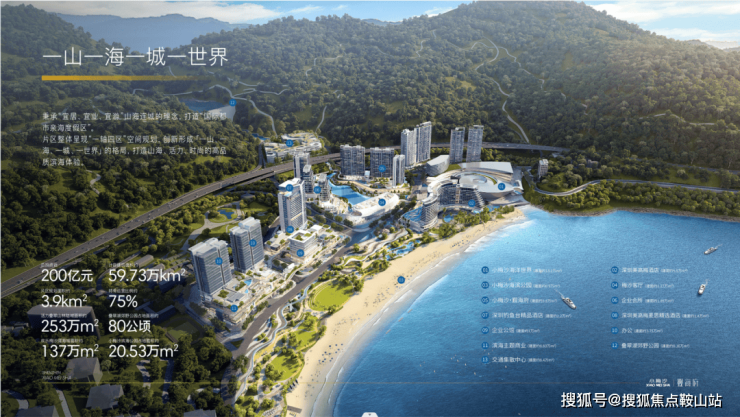 小梅沙片区统筹规划总面积约3.9平方公里,规划建筑面积约89万㎡,计容建筑面积约60万㎡,整体呈现“一轴四区”空间规划,创新形成「一山、一海、一城、一世界」的空间规划格局。