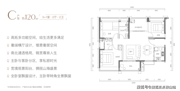 120㎡的3+1房2厅2卫(C户型),设计的是横厅南北通透格局,客餐厅6.45米的开间,进门独立玄关,4个卧室分别做到了3.6米/3.6米/3.6米/3米的宽度,U型厨房,得房率:74.07%(不含赠送),阳台主朝西南或东南向。
