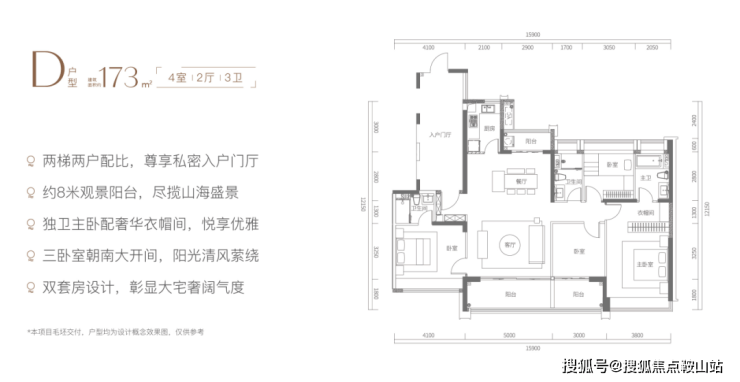 D户型为尊贵四房三卫设计,三卧室南向海景大开间,采用双套房配备私属卫浴设计,主卧配备专属奢华衣帽间,居住体验更为奢华。
